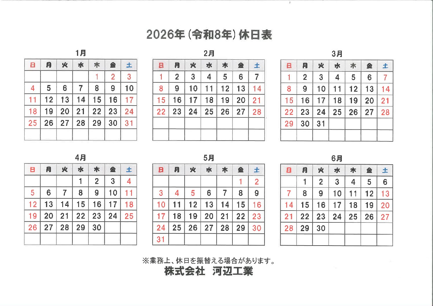 2026年1月~6月までの休日表をアップしました。